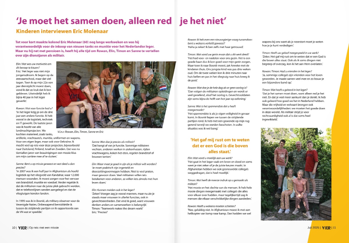 Het interview met kolonel Eric Molenaar in het blad Vier van de hervormde gemeente Waddinxveen is een boeiende en toegankelijke manier om de wereld van de krijgsmacht, een actueel onderwerp in deze tijd, dichter bij jonge lezers te brengen. Het sterke aan dit stuk is dat de vragen door kinderen gesteld worden. Hun nieuwsgierigheid en onbevangenheid zorgen voor een frisse invalshoek, terwijl de antwoorden van Eric zowel eerlijk als begrijpelijk blijven.